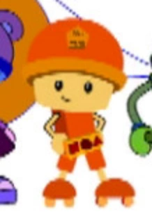 He has yellowish-orange skin with black eyes and a square head at the bottom that is round at the top. He wears an orange sleeveless shirt with matching orange shorts, and orange shoes as well. His helmet is also orange and has a light orange pentagon on it, resembling a construction worker's helmet.