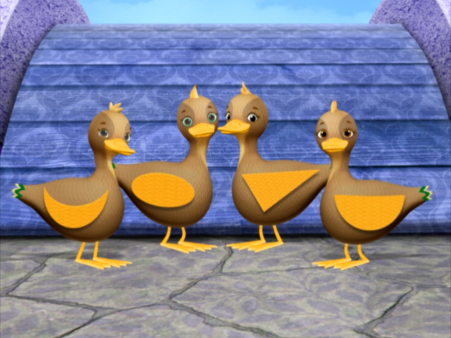 Four mallard ducks seen in Doctor Bot. They were blocking the bridge which was along the fastest way to the playground. It was because they were fighting over the duckling eggs since they had gotten mixed up. Dr. Bot used his x-ray machine to show which eggs belonged to which mama duck. Each duck has a different wing: semi-circle, oval, crescent, and triangle.